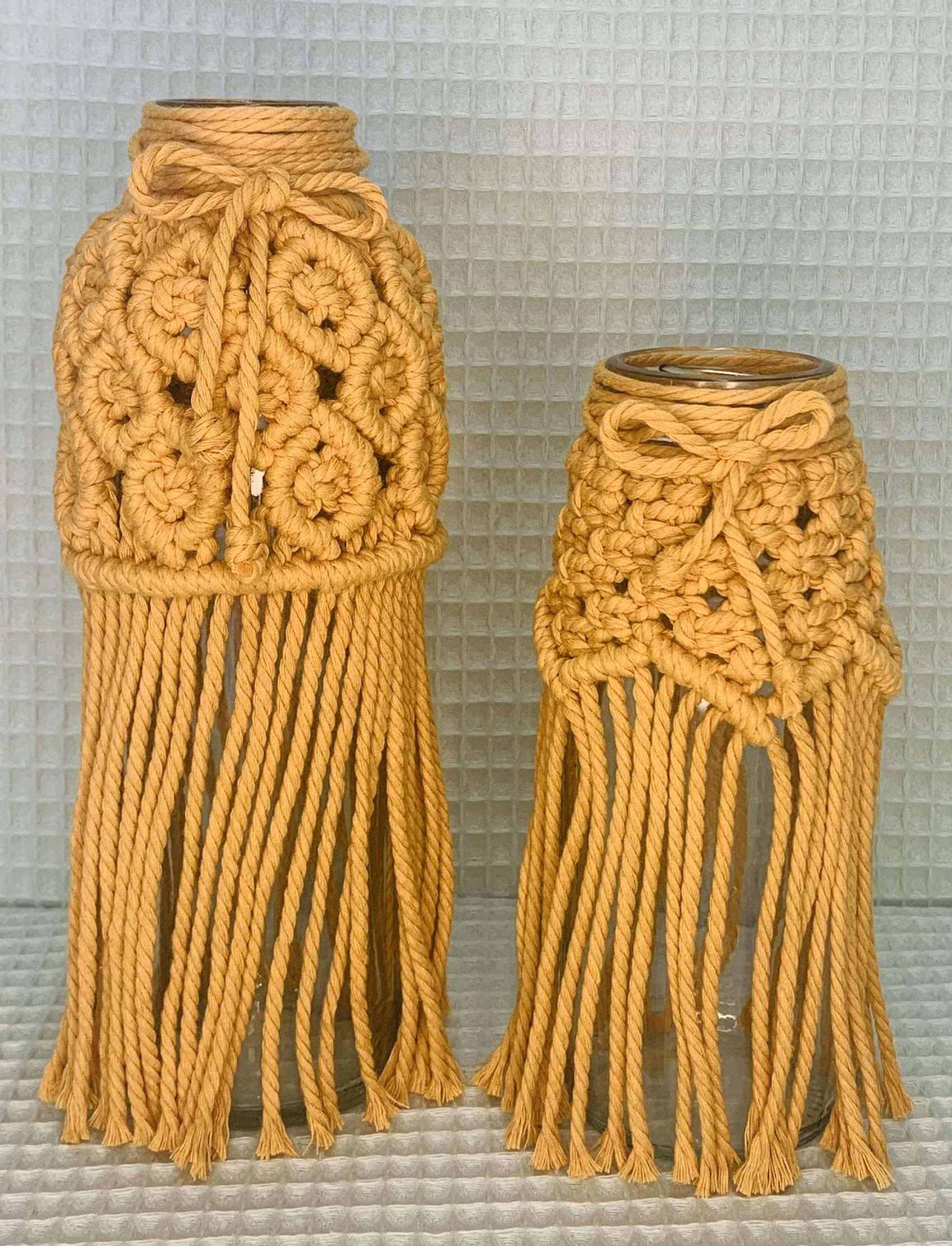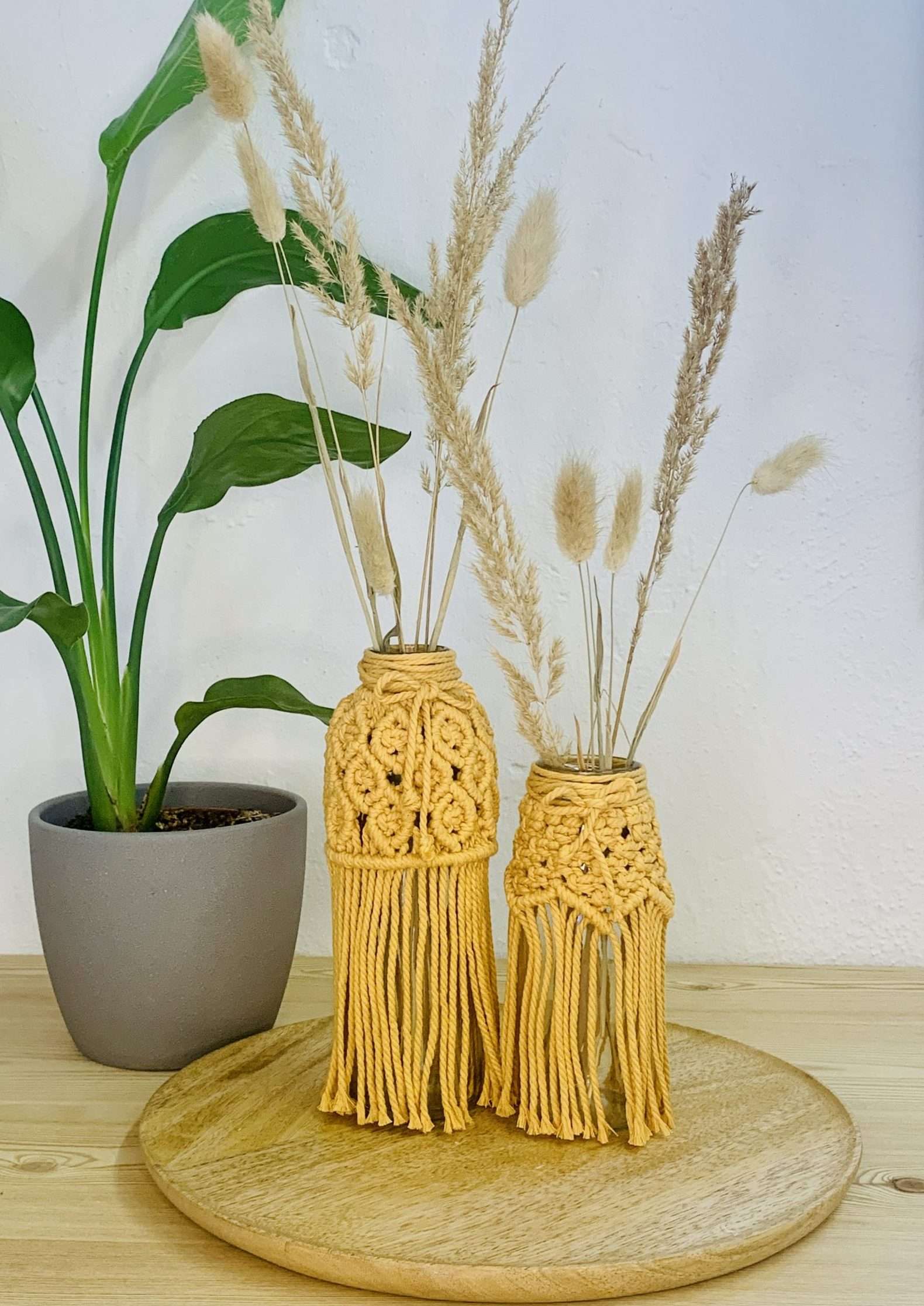 Dieses schöne Vasen-Set habe ich mit Garn in einem sonnigem Gelbton verarbeitet. Sie sind mit Sicherheit ein Eye-catcher in jeder Wohnung oder Terrasse.